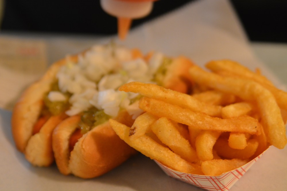 What: Chili cheese dog (me), dogs with relish and onions (Trav)